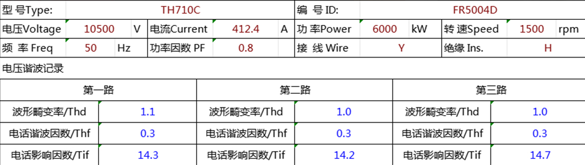 经严格测试,该6MW高、低压同轴发电机波形畸变率(THD)实测稳定≤1.1%,远优于<5%的国际标准,各项性能指标均达到国际先进水平。